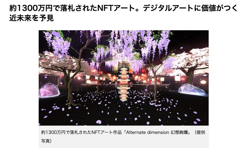 日本国内でもVRアーティストとして活躍するせきぐちあいみ氏のVR作品「Alternate dimension 幻想絢爛」が、NFTマーケットプレイスの「OpenSea」で約1,300万円で落札されたのも話題になりました。